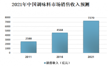 中國調味料市場在2011年至2016年經歷強勁增長,中國調味料的銷售收入由2011年的2588億元增長至2016年的4568億元,年復合增長率為12%。預計2016年至2021年將按9.7%年復合增速增長,銷售收入將于2021年達到7270億元。
