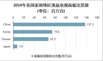 2019年全球液晶電視面板的總出貨量為2.87億臺。其中中國大陸大陸液晶電視面板供應過剩,價格大幅下跌。由于面板價格的下降,韓國制造商紛紛退出或暫停液晶電視面板的生產。中國臺灣液晶電視面板制造商也轉移到了附加值更高的廣視角IT面板產業。2019年中國大陸液晶電視面板的出貨量為1.37億臺,韓國出貨量為0.75億臺,中國臺灣出貨量為6750萬臺,日本出貨量僅有760萬臺。