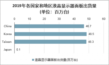 2019年各國家和地區液晶顯示器面板出貨量(單位:百萬臺)