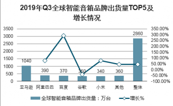 2019年Q3全球智能音箱品牌出貨量TOP5及增長情況