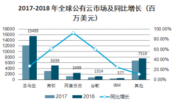 2017-2018 年全球公有云市場及同比增長(百萬美元)