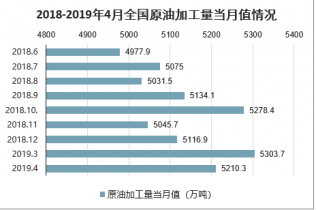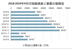 具體來看,2018年,我國原油一次加工能力達8.3億噸,但全年原油加工量僅6億噸,產(chǎn)能過剩現(xiàn)象較為嚴重。2019年4月全國原油加工量為5210.3萬噸,同比增長5.1%,增速比上月加快1.9個百分點。日均加工173.7萬噸,比上月增加2.6萬噸。2019年1-4月全國原油加工量達到20747萬噸,同比增長4.7%。