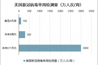 在新冠疫情全面爆發(fā)以來,美國因疫情導(dǎo)致的經(jīng)濟損失達到約3000億美元/月至4000億美元/月,洛克菲勒基金會最近提出實施成本高達1000億美元(約合7100億元人民幣)的“歷史上最大規(guī)模的公共健康檢測”計劃,要求將美國的新冠病毒檢測能力未來8周內(nèi)提高至300萬人次/周,未來6個月內(nèi)提高到3000萬人次/周。