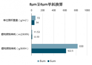 2、假設鋰電銅箔使用面積在不同厚度下一致,為11.53m2/kWh(通過單位面積質量及銅箔單耗質量進行換算);