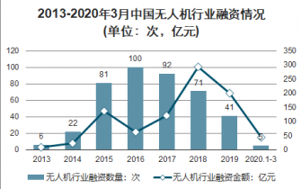 2013-2020年3月中國無人機行業(yè)融資情況(單位:次,億元)