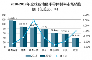 2018-2019年全球各地區(qū)半導(dǎo)體材料市場(chǎng)銷售額(億美元、%)