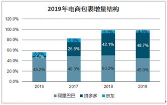 對電商快遞而言,在拼多多崛起之前,阿里在上游擁有強勢壟斷地位;拼多多崛起后,上游平臺的壟斷性有所弱化。2019年拼多多產生197億個訂單包裹,較2018年的111億個訂單包裹同比增長77%,包裹增量占行業增量比重或超越阿里。2019年通達系中來自阿里平臺包裹占比在50%左右,拼多多包裹占比達到20%以上。