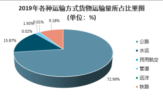 2019年各種貨運(yùn)運(yùn)輸量中公路運(yùn)輸量占比仍未最大,達(dá)到了73%,但與2018年相比,公路運(yùn)輸量占比有所下降,鐵路和水運(yùn)貨運(yùn)量占比上升。