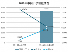 2019年中國小學(xué)總班數(shù)280.78萬個(gè),比上年增加5.39萬個(gè)。其中,56~65人的大班10.22萬個(gè),比上年減少6.36萬個(gè),占總班數(shù)的比例3.64%,比上年下降2.38個(gè)百分點(diǎn);66人以上的超大班6385個(gè),比上年減少6444個(gè),占總班數(shù)的比例0.23%,比上年下降0.24個(gè)百分點(diǎn)。
