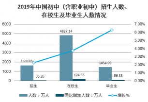 2019年中國初中學(xué)校5.24萬所(含職業(yè)初中11所),比上年增加433所,增長0.83%。招生1638.85萬人,比上年增加36.26萬人,增長2.26%;在校生4827.14萬人,比上年增加174.55萬人,增長3.75%;畢業(yè)生1454.09萬人,比上年增加86.33萬人,增長6.31%。初中階段毛入學(xué)率102.6%。
