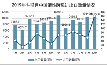 2019年1-12月中國活性酵母出口數量為106504.4噸,出口金額為22902.3萬美元。