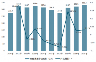 2010-2019年中國聚酯薄膜市場規模及增速 |