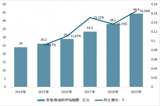 隨著各大物流快遞企業(yè)陸續(xù)登陸資本市場,紛紛加強對運輸能力、智能化處理能力及科技信息化投入,智能倉儲物流的布局是主要表現(xiàn)形式,目前,倉儲、配送一體化已經(jīng)成為物流、電商倉儲的發(fā)展趨勢。此外,在人力成本上升、土地資源有限、經(jīng)濟轉(zhuǎn)型升級等背景下,許多制造業(yè)企業(yè)開始以物流端為切入點進行自動化轉(zhuǎn)型升級。有軌堆垛機產(chǎn)品市場規(guī)模高速增長,2019年我國有軌堆垛機行業(yè)市場規(guī)模44.4億元,同比2018年的38.1億元增長了16.54%,近幾年我國有軌堆垛機行業(yè)市場規(guī)模情況如下圖所示:
