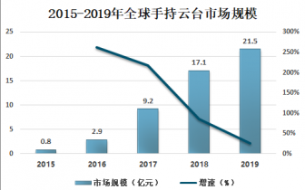 2015-2019年期間全球手持云臺市場規模總體呈逐年增長態勢,增速逐年放緩但仍保持較高水平。2019年全球手持云臺市場規模為21.5億元,同比增長26%。