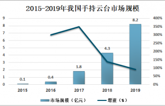 2015-2019年期間我國手持云臺市場規模總體呈逐年增長態勢,增速逐年放緩但仍保持較高水平。2019年中國手持云臺市場規模為8.2億元,同比增長91%。