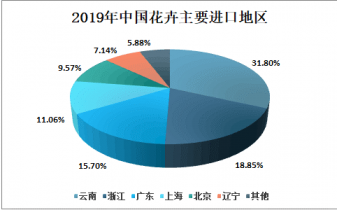 云南不僅是中國(guó)花卉生產(chǎn)大省,也是中國(guó)花卉進(jìn)口的主要地區(qū),進(jìn)口占比達(dá)31.8%。其次為浙江省,占全國(guó)花卉進(jìn)口的18.85%。云南、浙江、廣東、上海和北京花卉總進(jìn)口額2.27億元。