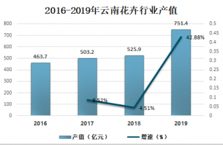 近年來(lái),云南花卉行業(yè)產(chǎn)值不斷上升。2016年云南花卉產(chǎn)值為463.7億元。2019年產(chǎn)值達(dá)到751.4億元,同比增長(zhǎng)42.88%,增幅是上年度的9.5倍,創(chuàng)近10年最大增幅。