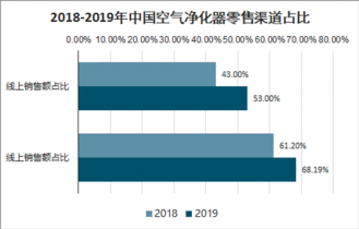 截至2019年11月,我國空氣凈化器線上市場銷售額為43.7億元,同比下降6.3%,銷量為282.1萬臺,同比增長0.8%,線下市場銷售額為38.0億元,同比下降34.1%,銷量為131.6萬臺,同比下降31.2%。線上渠道銷售額占比由2018年的43%提升到53%,線上渠道銷售量占比由2018年的61.2%提升到68.19%,線上渠道在空氣凈化器零售渠道中占據的位置越來越重要。