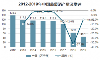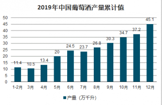 2018年全年中國葡萄酒產量達到了62.9萬千升,累計下降7.4%。截止至2019年12月中國葡萄酒產量為7.9萬千升,同比增長1.3%。累計方面,2019年1-12月中國葡萄酒產量達到45.1萬千升,與2018年相比減少了17.8萬千升,累計下降10.2%。