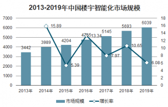 通過存量智能化市場以及樓宇智能化市場的計算,可知2019年我國樓宇智能化市場規(guī)模為6039億元,較上期增長6.08%。