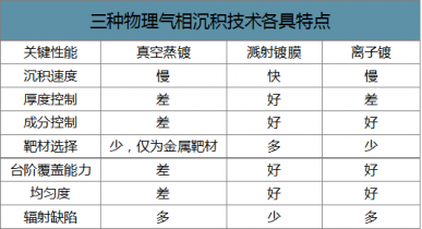 PVD工藝一般可以分為三種,分別是真空蒸鍍、濺射鍍膜和離子鍍。真空蒸鍍是在真空環境中對蒸鍍材料進行加熱獲得蒸汽,再將蒸發的物質沉積在目標基片上的過程。濺射鍍膜的原理是以成膜材料為靶,并作為陰極,同時以目標基板為陽極,在氬氣中加以高電壓使電離后的氬氣與陰極相撞擊,被撞擊出的靶材分子或原子在基板上堆積形成薄膜。離子鍍是通過將成膜材料高度電離化形成膜材料離子,從而增加膜材料離子的沉積動能,并使之在高化學活性狀態下沉積薄膜的技術。