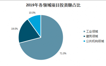 2019年,工業領域節能項目投資額占比達71%,建筑領域節能項目投資額占比達19%(其中商業及工業建筑領域投資額占比11%;公共機構建筑領域投資額占比8%),公共機構領域節能項目投資額占比10%。此比例與2018年及“十二五”末期的投資額分布基本一致,工業領域一直占據著主導地位。但建筑領域節能項目數量比例最高,為43%;工業領域節能項目數量占比緊隨其后,為41%;公共機構領域節能項目數量占比為16%,較2018年上升3個百分點。