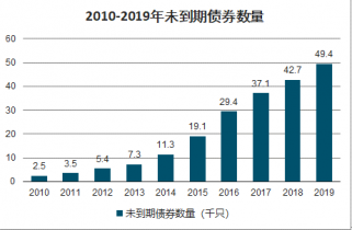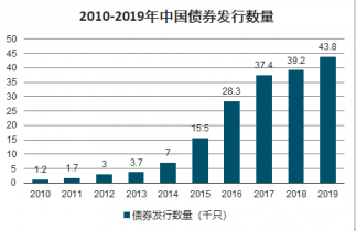 2019年,中國債券發行規模達45.19萬億元、發行數量43,824只,2010年至2019年年均復合增長率分別達19.13%和49.00%。規模不斷壯大的同時,中國債券品種也趨于豐富。自1981年中國國債恢復發行以來,企業債券、金融債券、可轉換債券、短期融資券、資產支持證券、分離交易可轉債、公司債券、中期票據、可交換債券、政府支持機構債、定向工具、中小企業私募債、項目收益票據和國際機構債等多個品種相繼涌現。
