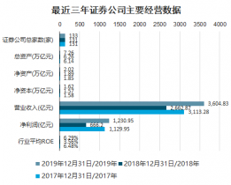中國證券行業的發展與多層次資本市場建設之間存在良性循環,伴隨著中國資本市場的發展,中國證券行業迅速成長。截至2019年12月31日,中國共有133家證券公司,總資產合計為7.26萬億元,凈資產合計為2.02萬億元,凈資本合計為1.62萬億元,2010年至2019年年均復合增長率分別達15.61%、15.16%和15.83%;2019年,133家證券公司實現營業收入3,604.83億元,凈利潤1,230.95億元,2010年至2019年年均復合增長率分別達7.21%和5.14%。2019年,證券行業平均ROE為6.29%。