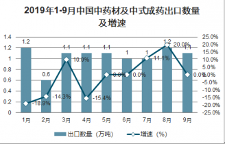 2019年1-9月中國中藥材及中式成藥出口數(shù)量及增速