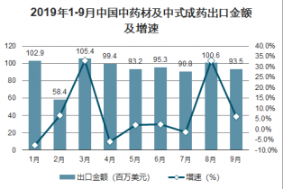 2019年1-9月中國中藥材及中式成藥出口金額及增速