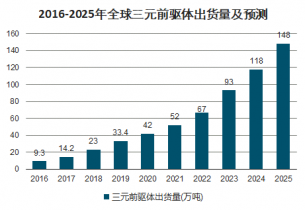 2016-2025年全球三元前驅(qū)體出貨量及預(yù)測(萬噸)
