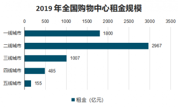 根據各個城市(已有數據主要為一二線城市和部分三線城市)已有項目面積、首層租金、空置率估算城市租金規模,公式為單城市購物中心租金規模=可租面積*首層平均租金*整棟平均租金占首層租金比例(按 40%測算)*(1-空置率)。由于少數三線和四五線城市數據缺失,按照單城市整體規模直接測算,具體假設為四線單城市租金總規模為已收錄三線城市單城市平均租金的 5 億元/城,五線為 1.5 億元/城。得出一二三四五線城市購物中心租金分別為 1800、2968、1007、485、155億元,全國總規模6413億元。約占 2019 年社零總額 41.16 萬億元的1.56%。
