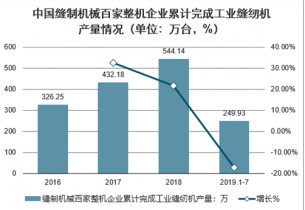 2018年,中國縫制機械行業恢復性增長態勢持續。2018年,中國縫制機械百家整機企業累計完成工業總產值208.17億元, 同比增長12.28%;累計生產工業縫紉機544.14萬臺,同比增長21.49%。但2019年在全球經濟總體放緩、中美貿易爭端持續 升級、內外銷市場承壓的背景下,行業產銷出現下行態勢。