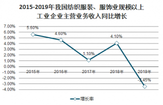 2015-2019年我國紡織服裝、服飾業規模以上工業企業主營業務收入同比增長