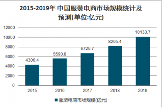 2015-2019年 中國服裝電商市場規模統計及預測(單位:億元)