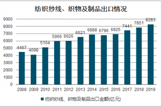 2017年全年規(guī)模以上工業(yè)中,紡織業(yè)增長4.0%,2018年增長1.00%,2019年增長1.30%。2018年全國限額以上服裝鞋帽、針紡織品類零售額同比增長8%,增速較上年提高0.20%,高于同期限額以上單位商品零售額增速2.30%。2019年,我國紡織品服裝內(nèi)銷市場增長速度有所放緩,全國限額以上服裝鞋帽、針紡織品類商品零售額同比增長2.90%,增速較2018年放緩5.10%。總體來看,雖然面臨國內(nèi)外經(jīng)濟(jì)增長波動、原材料及勞動力成本上升、匯率波動、行業(yè)競爭加劇等不利因素,我國紡織業(yè)總體保持穩(wěn)中增長的趨勢。近10年,我國紡織紗線、織物及制品出口整體呈現(xiàn)逐年上升趨勢。具體情況如下: