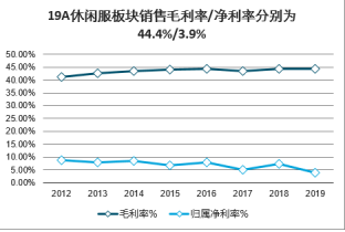 19A休閑服板塊銷售毛利率/凈利率分別為44.4%/3.9%