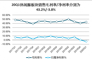 20Q1休閑服板塊銷售毛利率/凈利率分別為43.2%/-3.8%