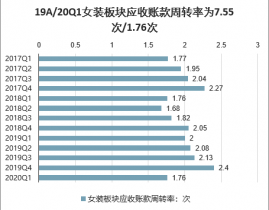 19A/20Q1女裝板塊應(yīng)收賬款周轉(zhuǎn)率為7.55次/1.76次