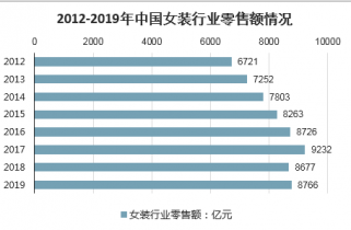 女裝行業(yè)是中國服裝產業(yè)的重要組成部分,其發(fā)展對我國服裝業(yè)的整體發(fā)展有著舉足輕重的作用。作為服裝行業(yè)的重要子行業(yè),女裝行業(yè)經過多年發(fā)展,已經形成一定的規(guī)模并跨入成熟期。2018年中國女裝行業(yè)零售額約為8677億元, 2019年女裝零售額將達8766億元。