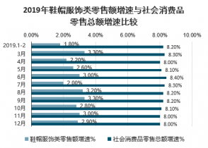 2019年1-12月,全國鞋帽服飾類零售額同比增加2.9%,低于同期社會消費品零售總額增速5.1個百分點。