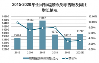 2015-2020年全國鞋帽服飾類零售額及同比增長情況