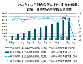2019年1-12月國內限額以上(企業)單位服裝、鞋帽、針紡織品類零售值及增速