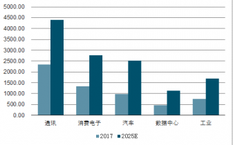 預測,至2025年,通訊、消費電子、汽車、工業、數據中心等領域的市場規模將分別增長到44.0億、27.7億、25.1億、117.0億、11.3億美元。其中汽車領域的增速最快,8年的年均復合增長率為13.1%。