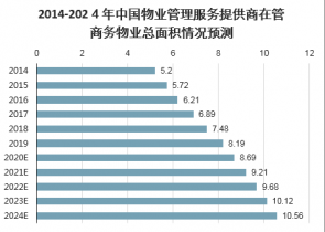 2014-2024年中國物業(yè)管理服務(wù)提供商在管商務(wù)物業(yè)總面積情況預(yù)測