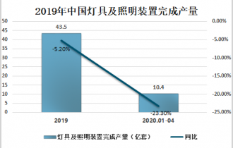 2019年全國照明制造業(yè)主要產(chǎn)品中,燈具及照明裝置完成產(chǎn)量43.5億套(臺、個),同比下降5.2。2020年1-4月中國燈具及照明裝置完成產(chǎn)量10.4億套(臺、個),同比下降23.3%。