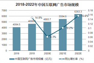 :2019年中國互聯(lián)網(wǎng)廣告市場規(guī)模為4699.9億元,預(yù)計2022年中國市場規(guī)模將達到6363.3,同比增長率為15.6%。