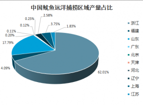 國內經營遠洋魷魚以浙江、山東、福建等幾個沿海省份為主,而消費市場主體也主要是這幾個省份,其中浙江舟山是我國遠洋魷魚的最大生產基地、輸入口岸和主要加工地區,是我國魷釣漁業第一市。2018年中國魷魚遠洋捕撈產量主要集中在浙江、山東、福建、上海、遼寧、江蘇、河北、廣東、天津、北京等省市,其中浙江、山東、福建、上海以及天津這五個省市2018年魷魚遠洋捕撈產量均較2017年有所增長,2018年浙江省產量為35.61萬噸,占全部遠洋捕撈產量的62.01%,同比增長15.58%,排在第二的山東省產量為1022萬噸。