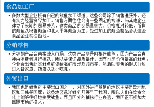我國魷魚主要來自于包括近海捕撈和遠洋捕撈在內的野生捕撈,所捕獲的魷魚主要有 3 個去向:食品加工廠、分銷零售以及外貿出口。