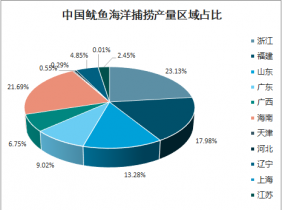 2018年中國魷魚海洋捕撈產量排名前五的省市分別是:浙江、海南、福建、山東以及廣東,其中浙江省海洋捕撈產量一直處于領先地位,2018年產量為6.76萬噸,占全部海洋捕撈產量的23.13%,其次為海南省6.33萬噸,占全部海洋捕撈產量的21.69%。